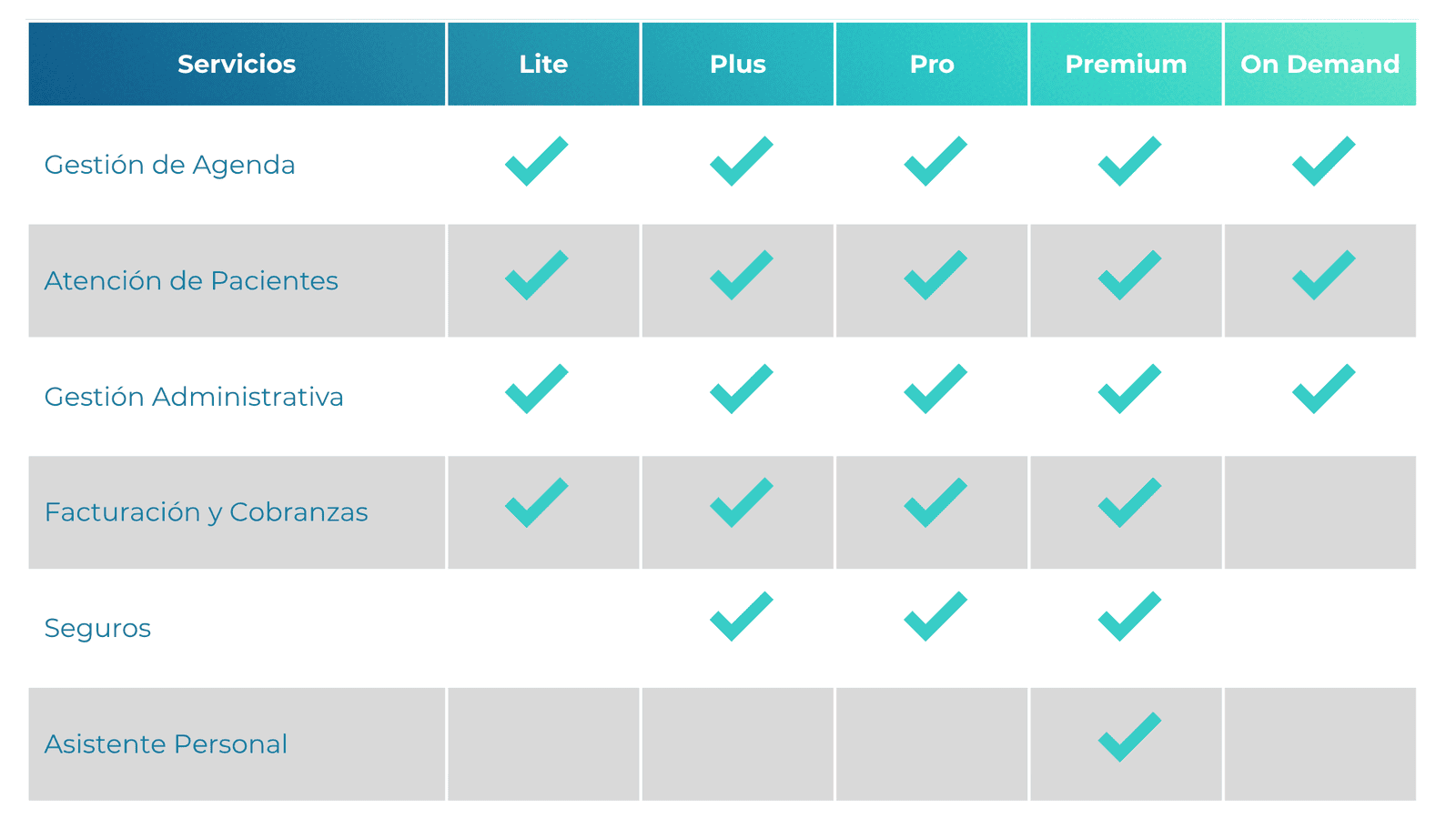 Dirigido a profesionales consolidados que desean olvidarse de lo operativo. Incluye gestión integral de agenda, administración, cobranzas, tramites con aseguradoras, soporte digital y asistencia en tareas personales, para que el médico se concentre solo en atender a sus pacientes.